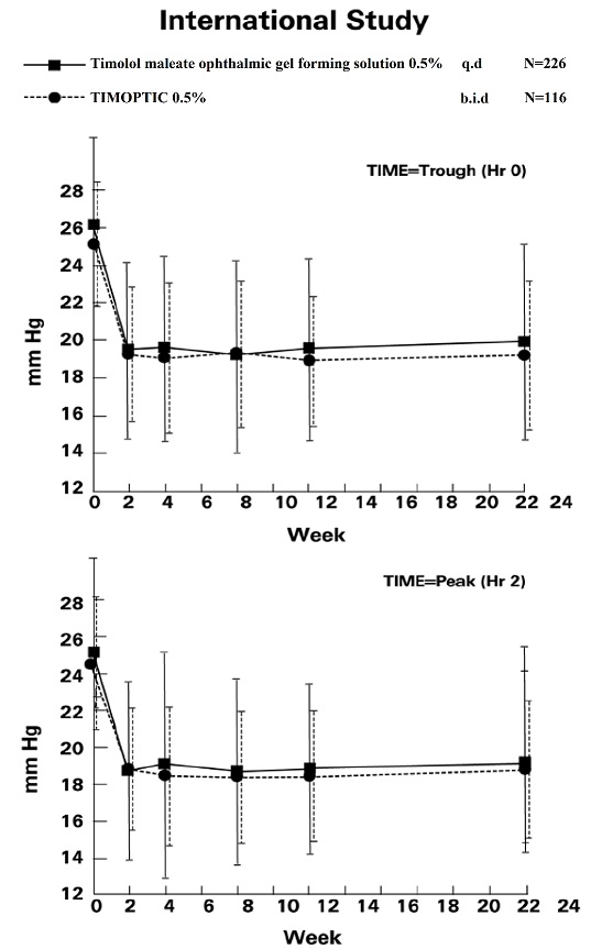 This text seems to describe a comparative study of two medications for ophthalmic use: Timolol maleate ophthalmic gel forming solution 0.5% once daily versus Timolol maleate ophthalmic solution 0.5% twice daily. The study likely includes data on intraocular pressure measurements at trough and peak times over the course of several weeks.*