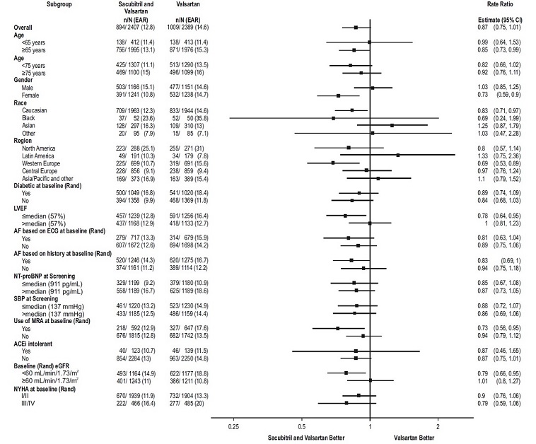 This data table provides information on the distribution of various factors in a population, such as age, gender, weight, race, medical conditions, medication use, and outcomes related to heart failure treatments (Sacubitril and Valsartan vs. Enalapril). The table shows the percentage of individuals falling into different subgroups based on these factors and also includes the hazard ratios for the two treatments, with Sacubitril and Valsartan being considered better in this comparison.*