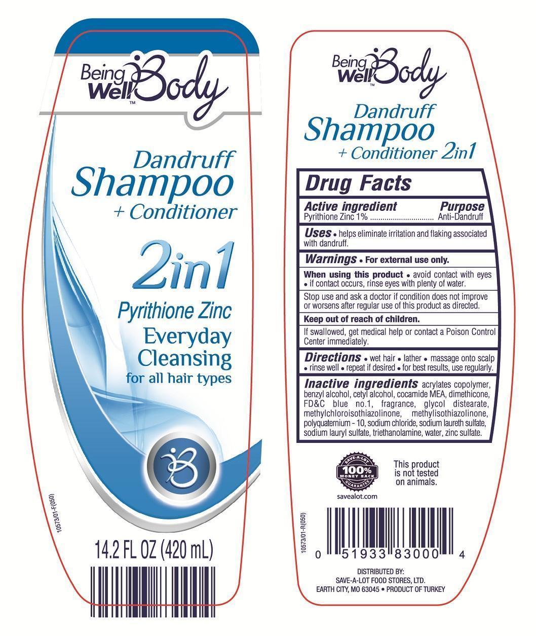 The following image provide visual information about the product associated with Being Well Body 2in1 Dandruff And Conditioner NDC 46994-510 by Save-a-lot Food Stores Ltd, such as packaging, labeling, and the appearance of the drug itself. This resource could be helpful for medical professionals, pharmacists, and patients seeking to verify medication information and ensure they have the correct product.