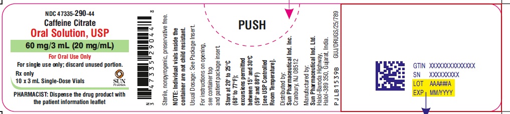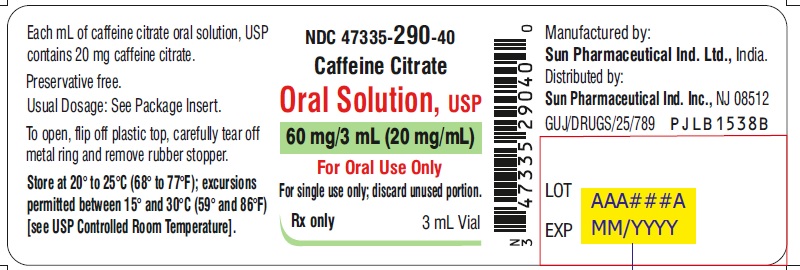 The following 5 images provide visual information about the product associated with Caffeine Citrate NDC 47335-290 by Sun Pharmaceutical Industries, Inc., such as packaging, labeling, and the appearance of the drug itself. This resource could be helpful for medical professionals, pharmacists, and patients seeking to verify medication information and ensure they have the correct product.
