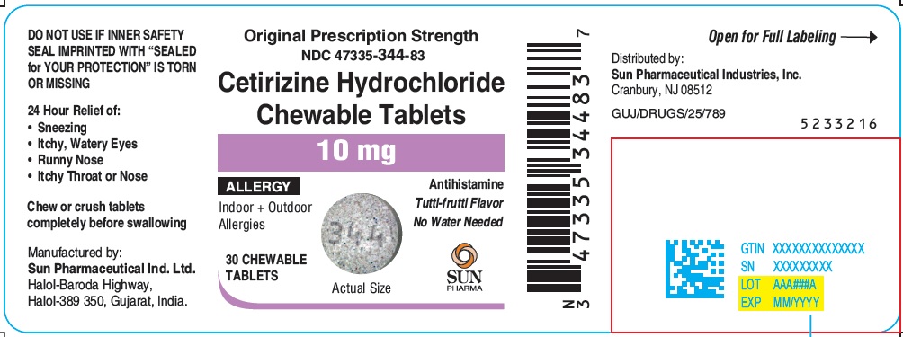 This is a label for Cetirizine Hydrochloride Chewable Tablets, manufactured by Sun Pharmaceutical Ind. Ltd. It provides 24-hour relief for sneezing, itchy and watery eyes, runny nose, and itchy throat or nose caused by indoor and outdoor allergies. The tablets come in a tutti-frutti flavor and do not require water. Consumers are advised not to use the tablets if the inner safety seal is missing or torn. The label also includes manufacturing and distribution details, as well as the National Drug Code (NDC) and other identification numbers.*