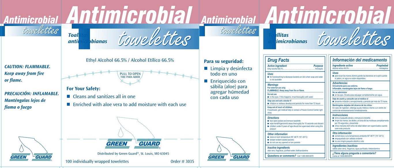 Antimicrobial wipes containing 66.5% ethyl alcohol for cleaning and sanitizing. Enriched with aloe vera to add moisture with each use. The product comes in individually wrapped towelettes. The label includes drug facts and safety information. Distributed by Green Guard in St. Louis, MO.*
