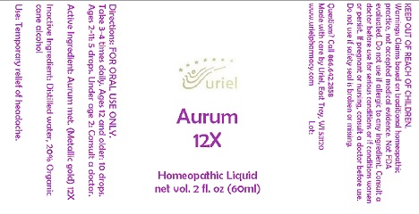 This appears to be the description of a homeopathic liquid medication. The product is 2 liters in volume and contains Aurum met. (a metallic gold) as the active ingredient. The liquid is made up of 20% organic distilled water. This medicine may be used for temporary relief of headaches.*