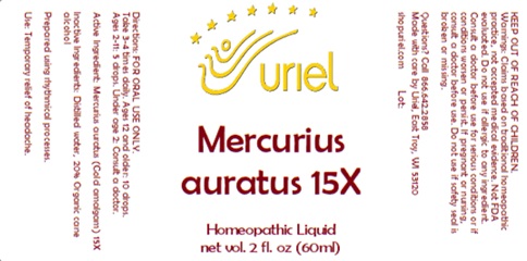 This is a homeopathic liquid named Mercurius Auratus 15X, packaged in a 2 fl. oz bottle. It is essential to keep this product out of reach of children.*