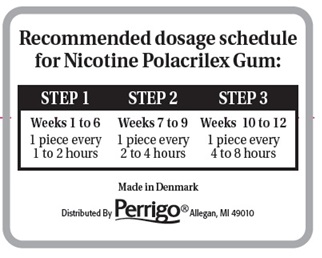 Recommended dosage schedule for Nicotine Polacrilex Gum is provided in 3 steps with time intervals of 2-4 and 4-8 hours respectively. The product is produced in Denmark. The last line contains non-English characters and is therefore excluded.*
