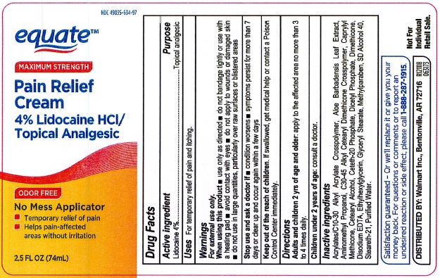 The following image provide visual information about the product associated with Equate Pain Relief Cream NDC 49035-634 by Walmart, Inc, such as packaging, labeling, and the appearance of the drug itself. This resource could be helpful for medical professionals, pharmacists, and patients seeking to verify medication information and ensure they have the correct product.
