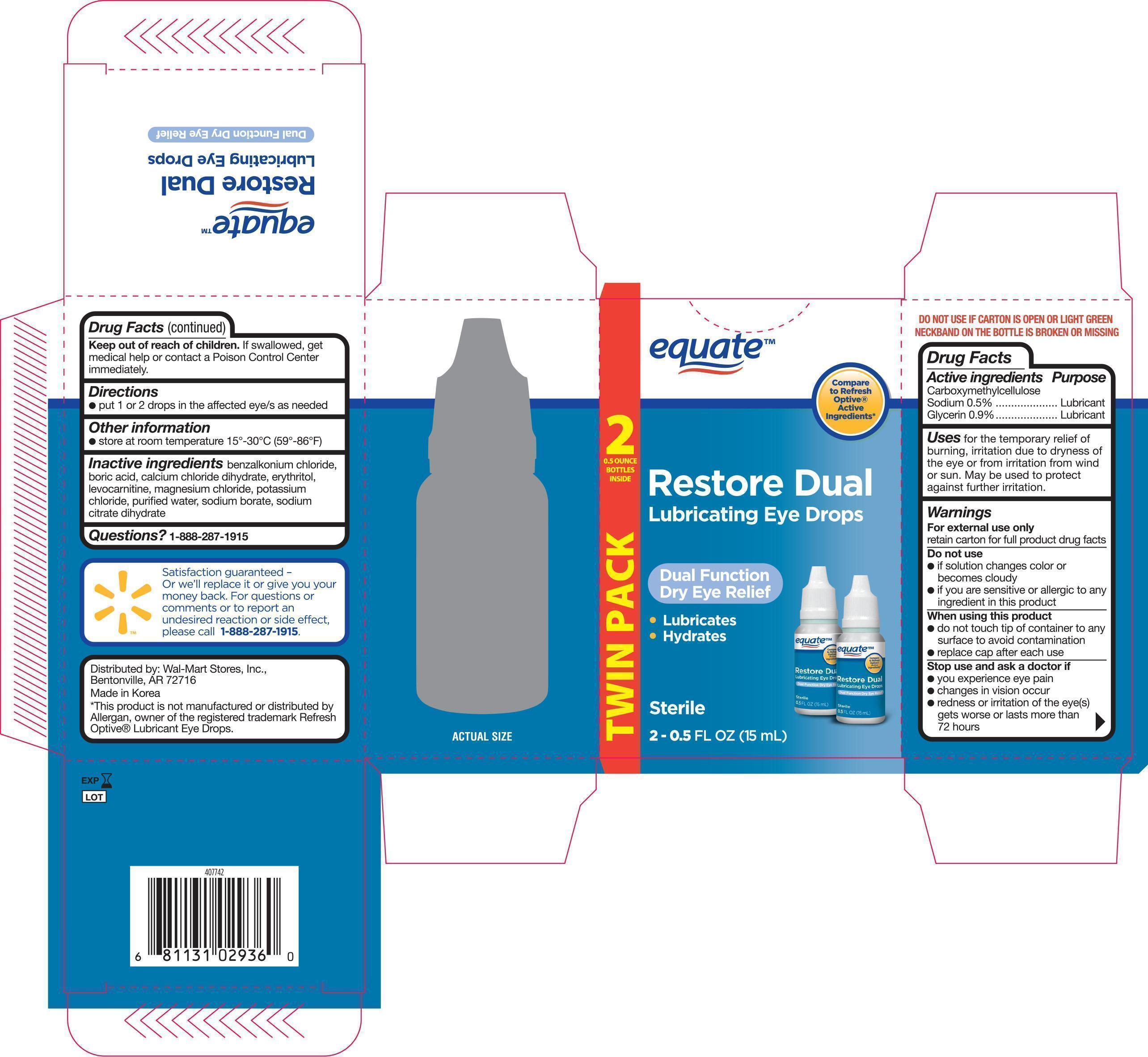 This lubricating eye drops are designed for temporary relief of burning and irritation due to dryness of the eye or from irritation from wind or sun. The product package contains two 0.5fl oz bottles. It should be stored at room temperature and should not be used if the carton is open or the neckband on the bottle is broken or missing. If swallowed, seek medical help or contact a Poison Control Center immediately. Do not use if the solution changes color or becomes cloudy. If you experience eye pain or any changes in vision or redness or irritation of the eye(s) that last more than 72 hours, stop use and ask a doctor. This product is distributed by Wal-Mart Stores, Inc., Bentonville, AR 72716 and made in Korea.*
