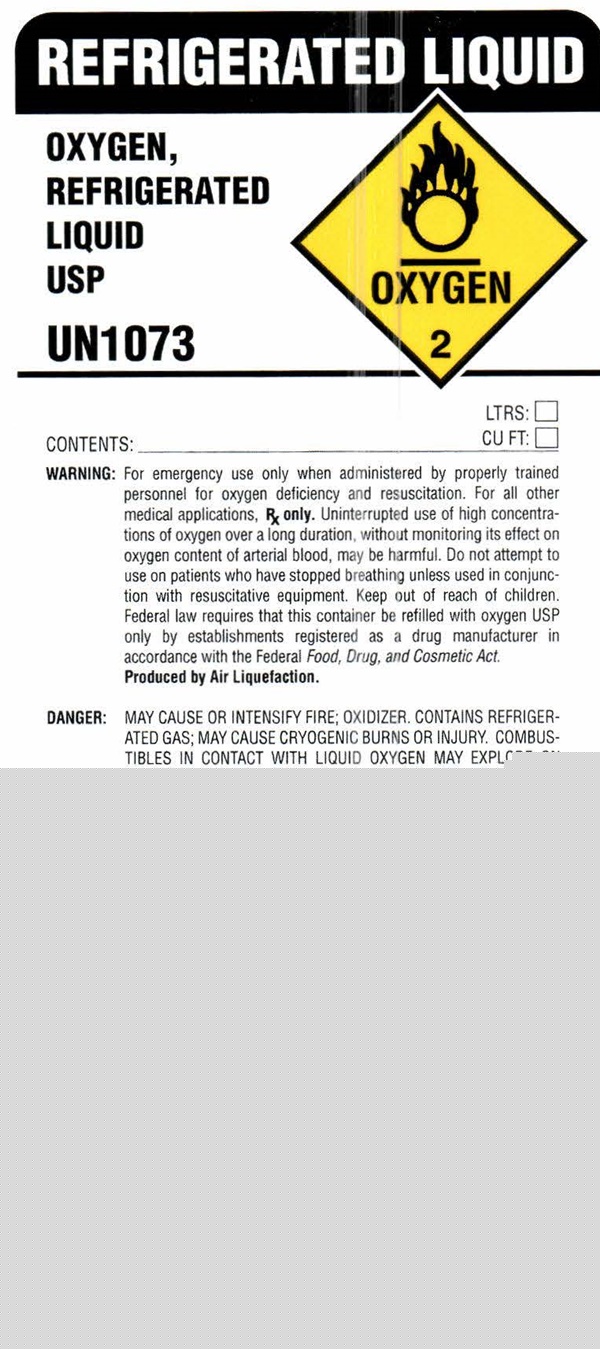 This text contains important safety warnings and instructions for handling a container of refrigerated liquid oxygen. The oxygen is intended for emergency use for oxygen deficiency and resuscitation by trained personnel. The uninterrupted use of high concentrations of oxygen can be harmful without monitoring its effect on arterial blood oxygen content. Federal law requires refilling the container with oxygen USP only by registered drug manufacturers. The container may cause or intensify fire and may cause cryogenic burns or injury. Combustibles in contact with liquid oxygen may explode.*