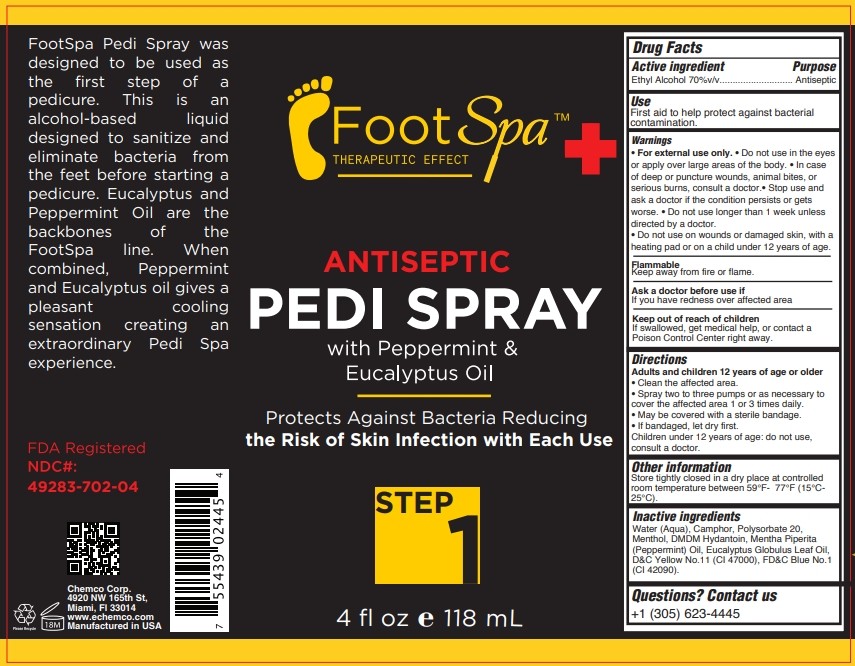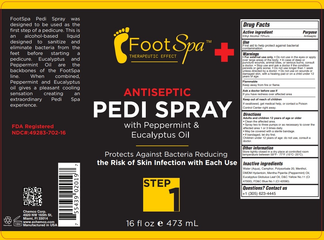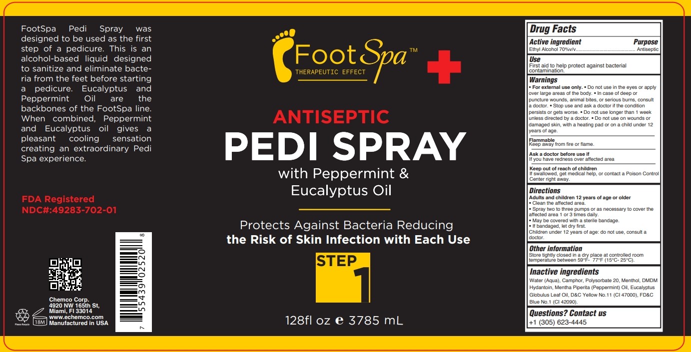 The following 3 images provide visual information about the product associated with Footspa Pedi NDC 49283-702 by Chemco Corporation, such as packaging, labeling, and the appearance of the drug itself. This resource could be helpful for medical professionals, pharmacists, and patients seeking to verify medication information and ensure they have the correct product.