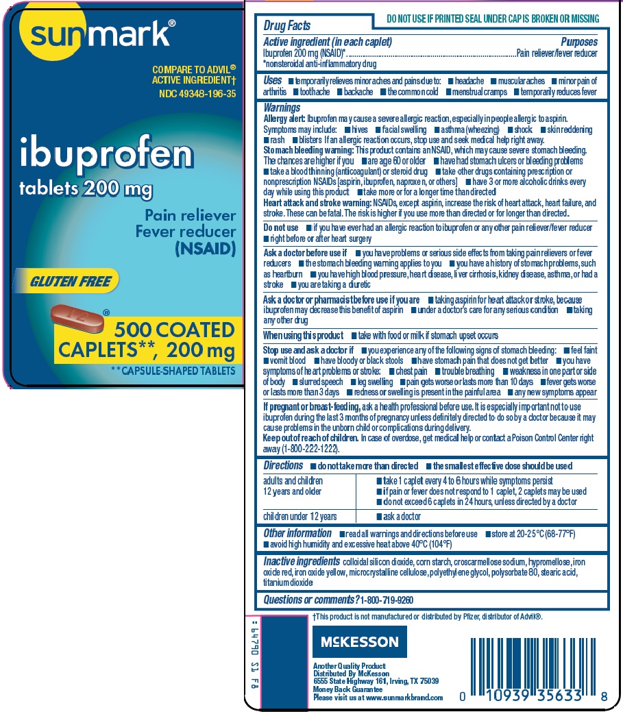 The following image provide visual information about the product associated with Sunmark Ibuprofen NDC 49348-196 by Strategic Sourcing Services Llc, such as packaging, labeling, and the appearance of the drug itself. This resource could be helpful for medical professionals, pharmacists, and patients seeking to verify medication information and ensure they have the correct product.