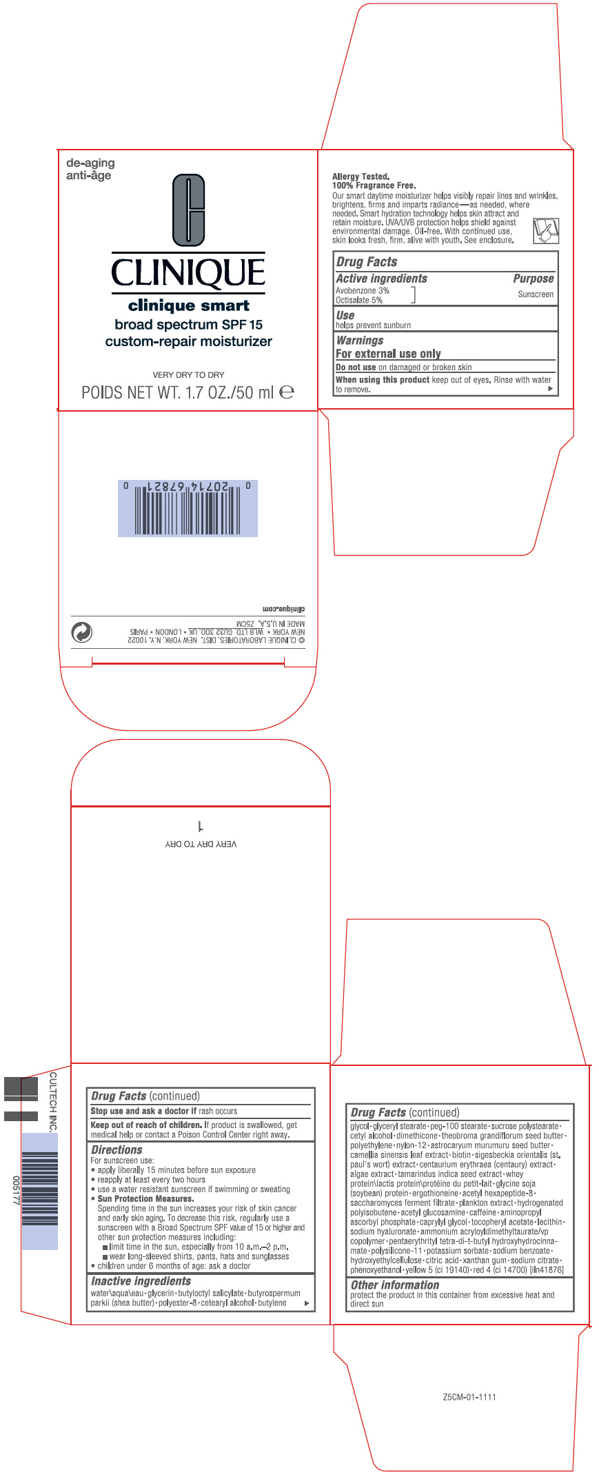 This is a description of Clinique's Smart Custom-Repair Moisturizer Broad Spectrum SPF 15, designed for very dry to dry skin. The moisturizer contains anti-aging and de-aging properties and is fragrance-free and allergy-tested. The product also offers UV protection and helps to brighten, firm, and repair skin while shielding against environmental damage. The formula contains a blend of ingredients, such as butyrospermum parkii (shea butter), biotin, and saccharomyces ferment filtrate, among others. Additionally, the text includes information on the sunscreen's active and inactive ingredients, directions for use, and warnings.*