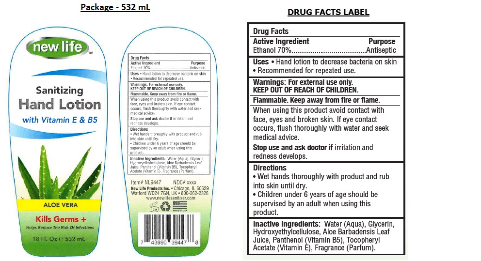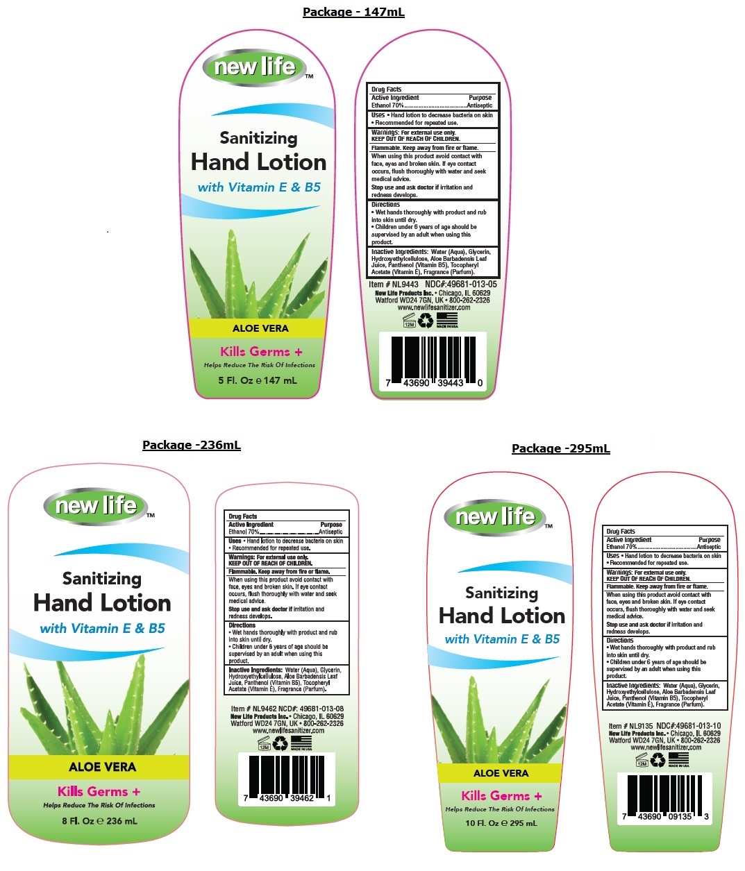 The following 2 images provide visual information about the product associated with New Life Sanitizing Handlotion With Vitamin E And B5- Aloe Vera NDC 49681-013 by New Life Products, Inc., such as packaging, labeling, and the appearance of the drug itself. This resource could be helpful for medical professionals, pharmacists, and patients seeking to verify medication information and ensure they have the correct product.