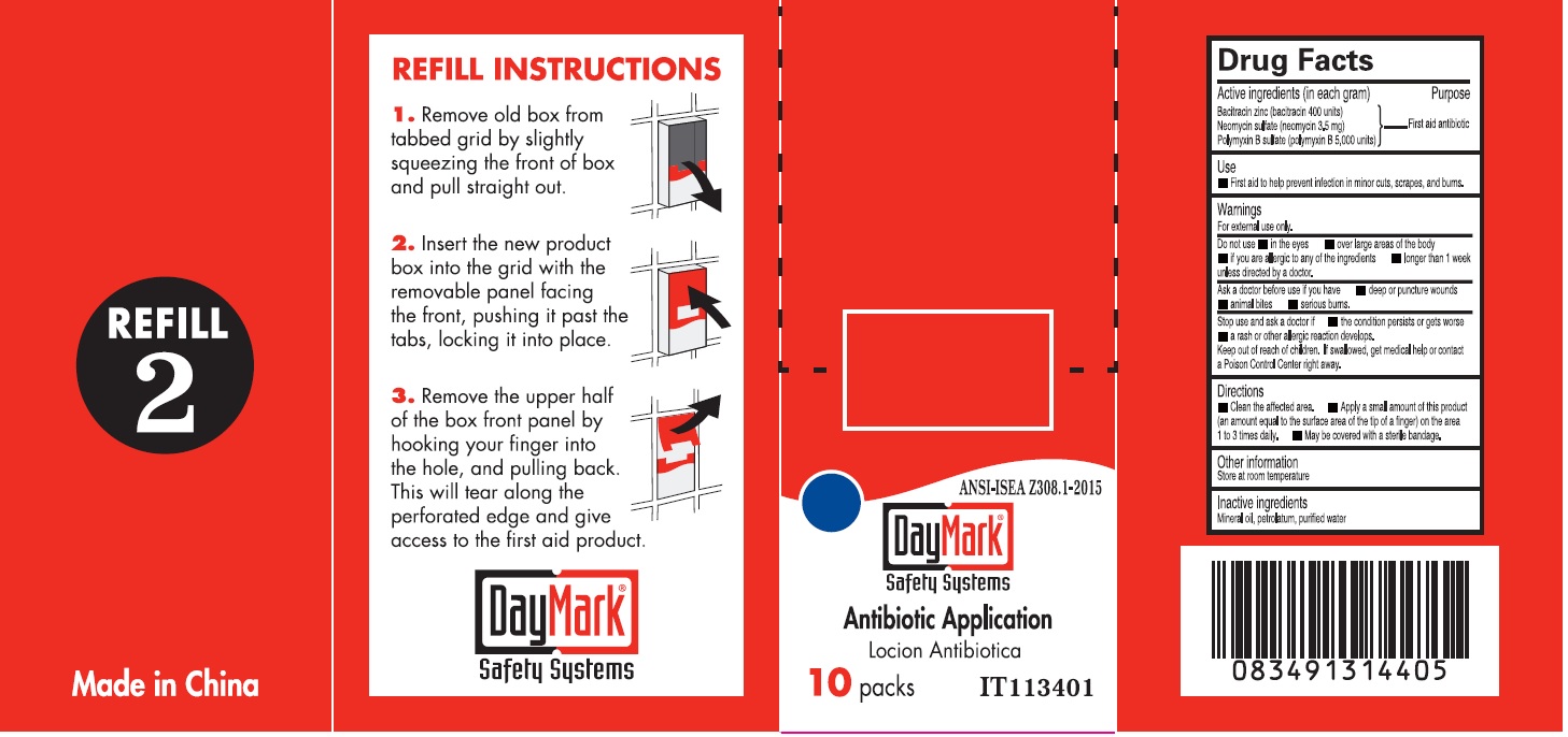 This text provides instructions for refilling a product box made in China. It suggests removing the old box from a tabbed grid and replacing it with a new one by following a few steps. Additionally, the text includes information about Safety Systems and lists the Drug Facts for a product called Locion Antibiotica.*
