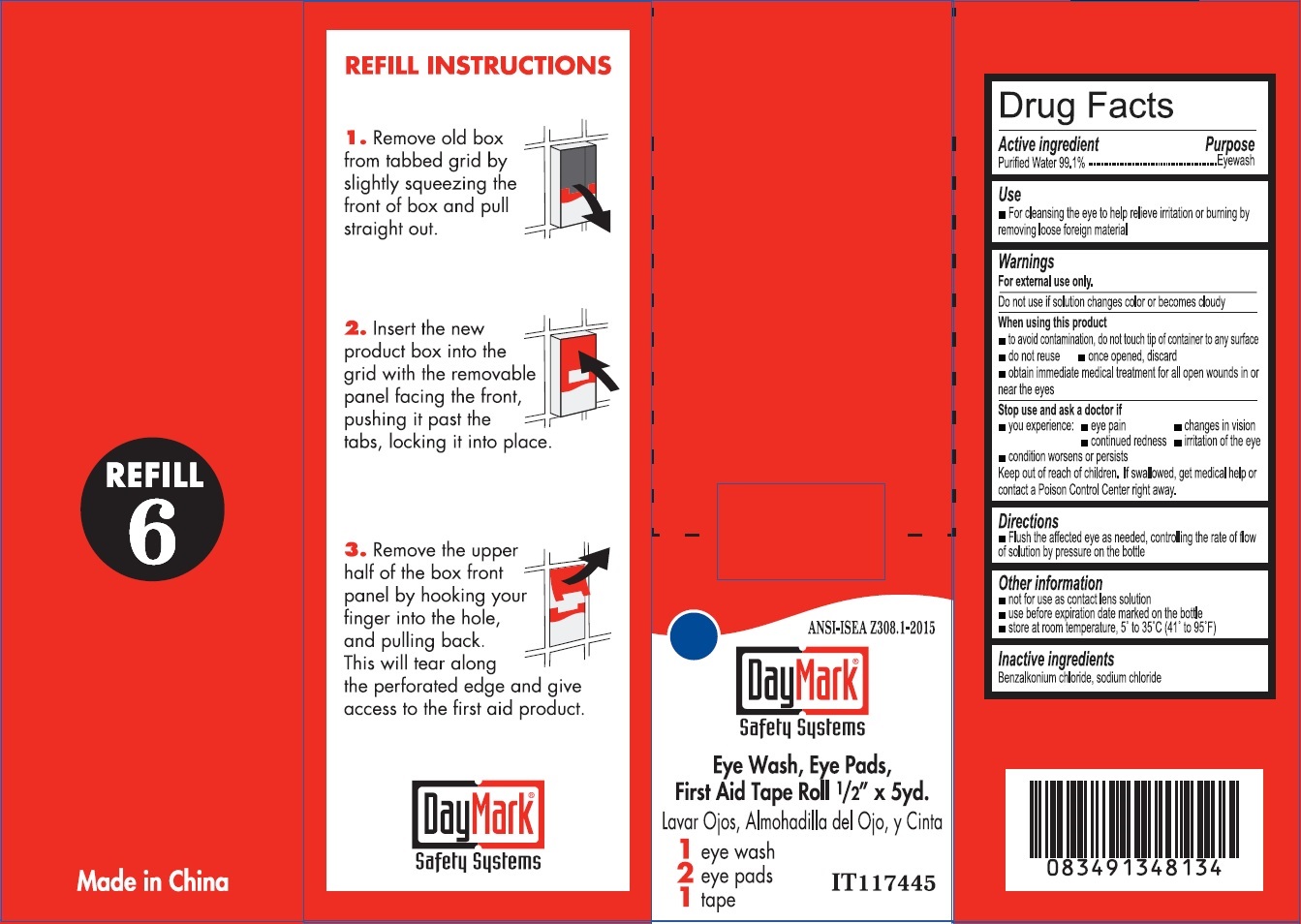 This is a set of instructions for the refill of a product box. The text provides a step-by-step guide on how to remove an old box and insert a new one into the tabbed grid. The contents of the product box include an eye wash, eye pads, and first aid tape roll. The text also includes warnings and directions for use, as well as information on the active ingredient (Benzalkonium chloride and sodium chloride). There is also a product code (IT117445) printed on the text.*