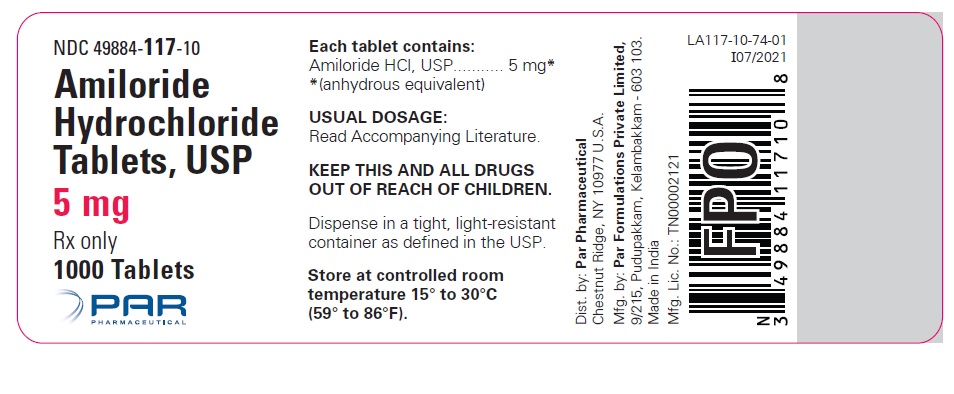This is a description of a medication called "Amiloride Hydrochloride Tablets, USP" with 5mg strength and a package size of 100 tablets. It contains a warning to keep it out of reach of children and to dispense it in a tightly sealed, light-resistant container. The proper storage temperature should be between 15-30°C (59°-86°F). The manufacturer is Par Pharmaceutical and the NDC code is 49884-117-01. The accompanying literature should be read to know the usual dosage.*