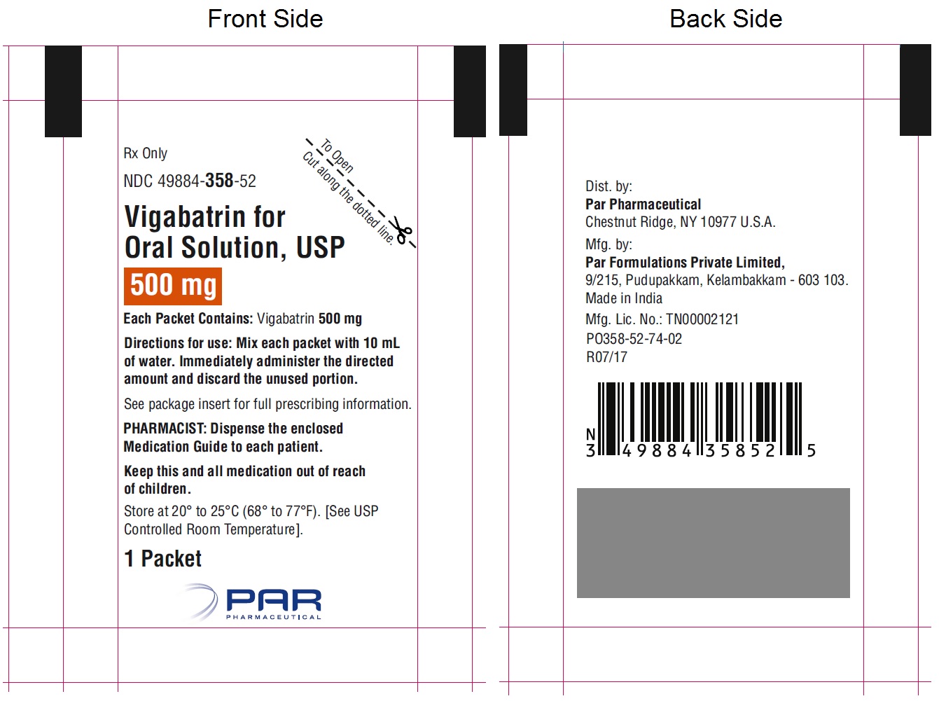 This is a description of a medication, Vigabatrin, which is available in the form of an oral solution. The solution is manufactured by Par Formulations Private Limited, in India, and distributed by Par Pharmaceutical in the US, with Rx only. Each packet contains 500 mg of the medication, and should be mixed with 10 mL of water before consumption. The unused portion should be discarded, and the full prescribing information is included in the package insert. The medication should be kept out of the reach of children and stored between 20°C to 25°C.*