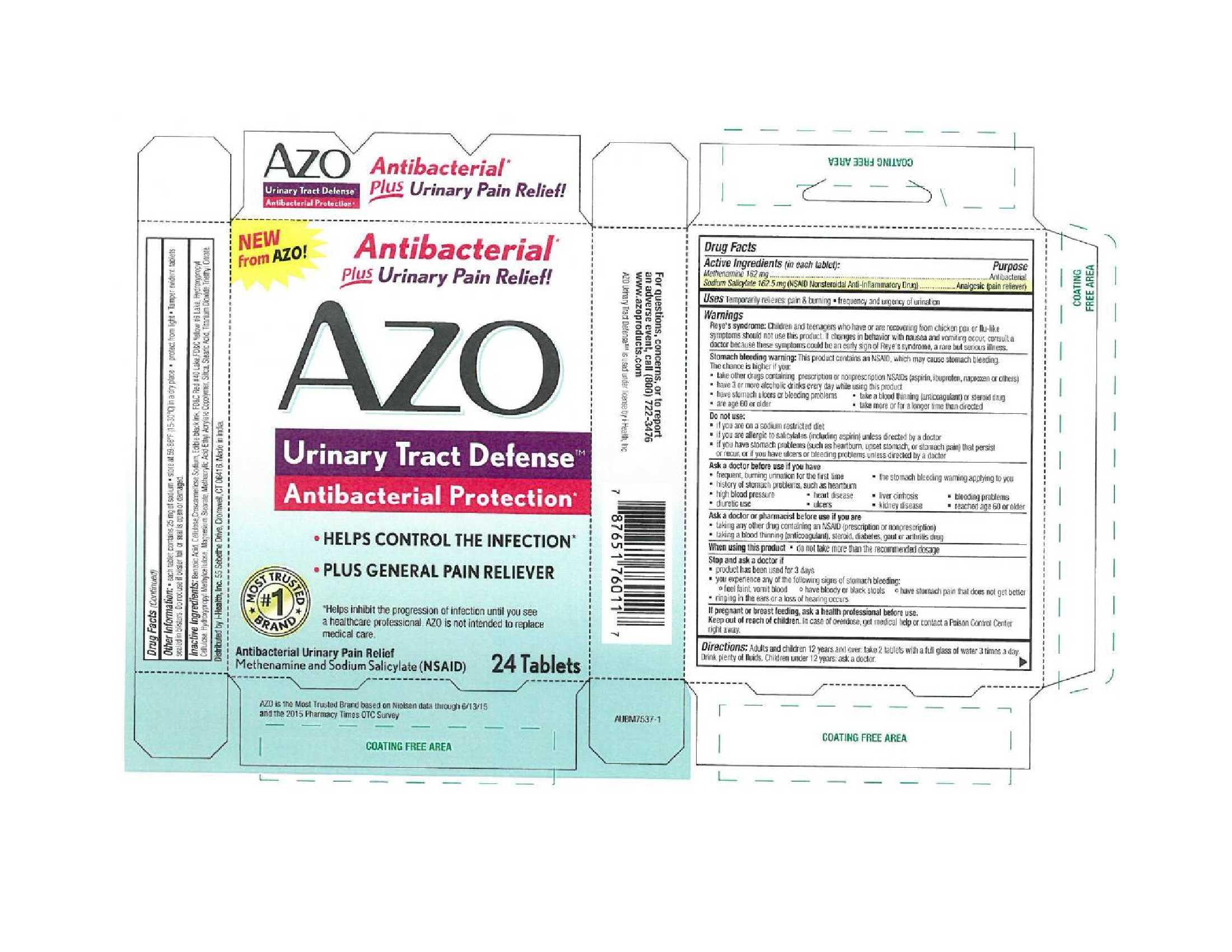 This is a description of a medication called AZO Antibacterial which provides Urinary Pain Relief. It relieves pain and burning sensations, and helps with urgency and frequency of urination. The active ingredients include Methenamine and Sodium Salicytate. The medication is not to be used if there are signs of Reyes syndrome or if there are stomach problems. The medication is not recommended for people with allergies to Salicylates, people over the age of 60 or if taking more than 8 days. In case of stomach problems or ulcers consult a doctor before use.*