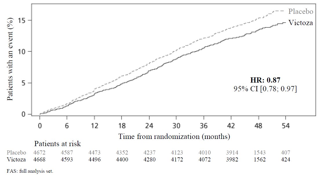 The LEADER trial (NCT01179048) was a multi-national, multi-center, placebo-controlled, double-blind trial. In this study, 9340 patients with inadequately controlled type 2 diabetes and atherosclerotic cardiovascular disease were randomized to VICTOZA 1.8 mg or placebo for a median duration of 3.5 years. The study compared the risk of major adverse cardiovascular events between VICTOZA and placebo when these were added to, and used concomitantly with, background standard of care treatments for type 2 diabetes. The primary endpoint, MACE, was the time to first occurrence of a three part composite outcome which included; cardiovascular death, non-fatal myocardial infarction and non-fatal stroke.