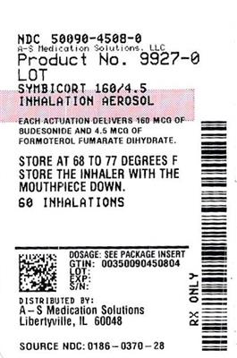 This description provides important information about a medication product with NDC code 50096-4508-0 called SYMBICORT 160/4.5 INHALATION AEROSOL. Each actuation delivers 160 mcg of budesonide and 4.5 mcg of formoterol fumarate dihydrate. The inhaler should be stored at 68 to 77 degrees Fahrenheit with the mouthpiece down. It includes 66 inhalations. Distributed by AS Medication Solutions, Libertyville, IL 60048. It is prescription-only. Source NDC is 0186037028.*
