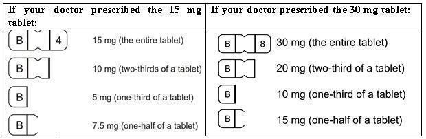 This appears to be a list of dosage instructions for a medication available in tablet form. The dosages appear to range from 10mg to 30mg and are provided in fractions of tablets to be taken based on the doctor's prescription.*