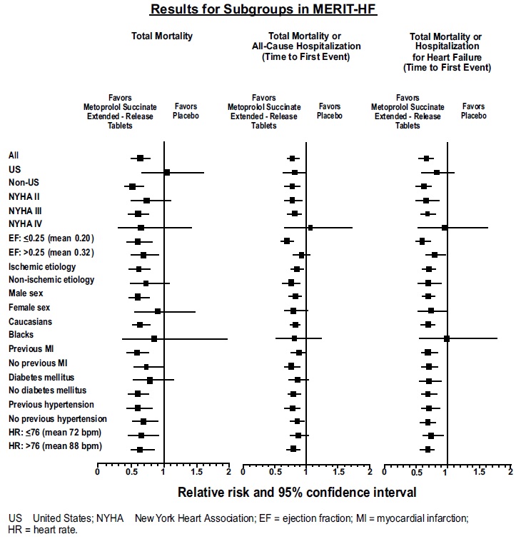 MERIT-HF was a randomized double-blind, placebo-controlled study of metoprolol succinate extended-release tablets in which 3991 patients with ejection fraction ≤0.40 and NYHA Class II-IV heart failure attributable to ischemia, hypertension, or cardiomyopathy were randomized 1:1 to metoprolol succinate extended-release tablets or placebo. The protocol excluded patients with contraindications to betablocker use, those expected to undergo heart surgery, and those within 28 days of myocardial infarction or unstable angina. The primary endpoints of the trial were (1) all-cause mortality plus all-cause hospitalization (time to first event) and (2) all-cause mortality. Patients were stabilized on optimal concomitant therapy for heart failure, including diuretics, ACE inhibitors, cardiac glycosides, and nitrates. At randomization, 41% of patients were NYHA Class II; 55% NYHA Class III; 65% of patients had heart failure attributed to ischemic heart disease; 44% had a history of hypertension; 25% had diabetes mellitus; 48% had a history of myocardial infarction. Among patients in the trial, 90% were on diuretics, 89% were on ACE inhibitors, 64% were on digitalis, 27% were on a lipid-lowering agent, 37% were on an oral anticoagulant, and the mean ejection fraction was 0.28. The mean duration of follow-up was one year. At the end of the study, the mean daily dose of metoprolol succinate extended-release tablets were 159 mg.