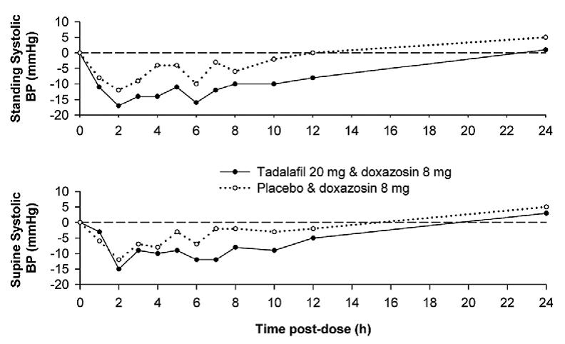 This is a table showing the standing and supine systolic blood pressure measurements (in mmHg) at various time points post-dose for individuals taking Tadalafil 20 mg & doxazosin 8 mg and Placebo & doxazosin 8 mg.*