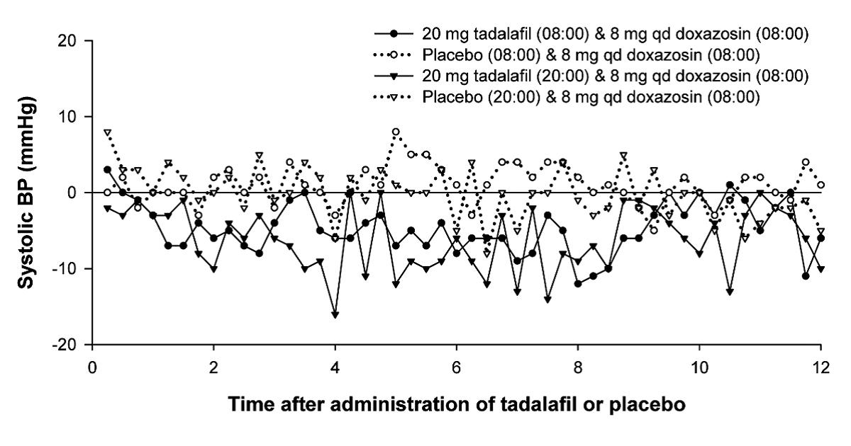 This text appears to show different scenarios of dosing involving tadalafil and doxazosin at different times, with corresponding systolic blood pressure readings. The study or data presented may be evaluating the effects of these medications on blood pressure at different time points.*