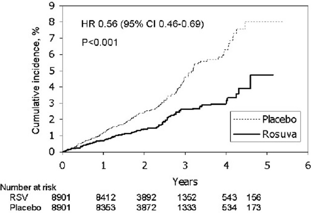 This text provides data from a study comparing the efficacy of Rosuva 20 mg with Placebo 20 mg in a group of 8901 individuals. The results show the hazard ratios (HR) and confidence intervals for various endpoints such as the primary endpoint (MCE), cardiovascular death, nonfatal stroke, nonfatal MI, and unstable angina. The study also includes information on hospitalizations, arterial revascularization, and definitions related to cardiovascular death. The results indicate statistically significant differences between the two treatment groups for most of the endpoints evaluated.*