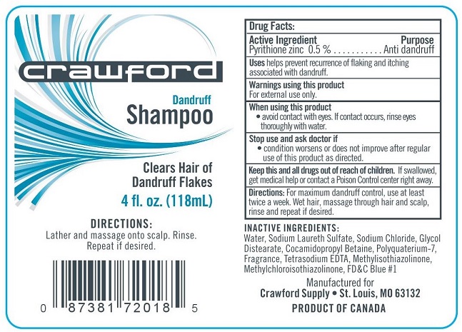 This is a drug fact label for a hair product that helps prevent recurrence of dandruff flakes. It contains pyrithione zinc as an active ingredient and can be used by applying, massaging onto scalp and rinsing. The label includes directions, warnings, and inactive ingredients. This product is manufactured by Crawford Supply in Canada.*