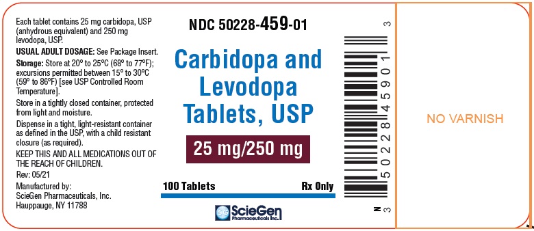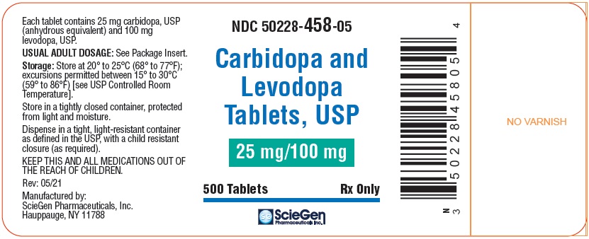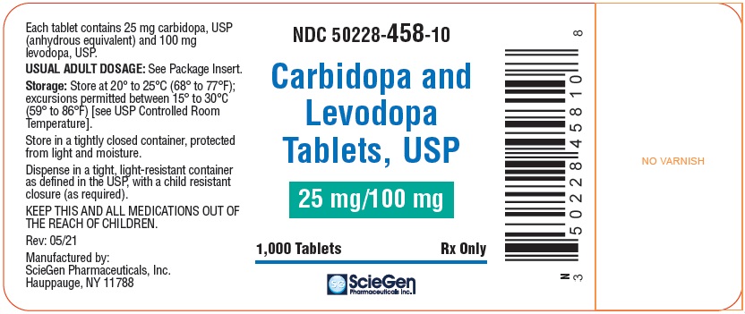 Carbidopa and Levodopa Tablets, USP are a medication used in the management of Parkinson's disease. Each tablet contains 10 mg carbidopa, USP (anhydrous equivalent) and 100 mg levodopa, USP. The usual adult dosage should be referred to from the package insert. Store tightly closed at a temperature of 20°C to 25°C (68°F to 77°F), with excursions permitted between 15°C to 30°C (59°F to 86°F). Dispense in a light-resistant container as defined in the USP, with a child-resistant closure (as required). This medication should be kept out of the reach of children. The product is manufactured by ScieGen Pharmaceuticals, Inc. The NDC number is 50228-457-10.*