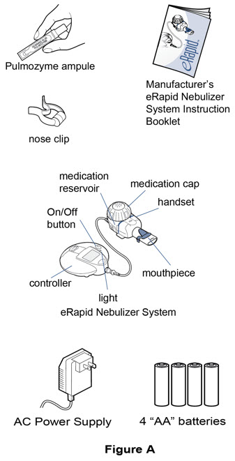 This text appears to be a list of components related to a medical device, specifically a nebulizer system called "eRapid". The components include a Pulmozyme ampule, instruction booklet, nose clip, medication reservoir and cap, handset, button, light, and an AC power supply. It seems that the nebulizer system can be powered both by batteries and by plugging in the AC power supply. There is also a diagram, labeled as Figure A, possibly illustrating the different components of the nebulizer system.*