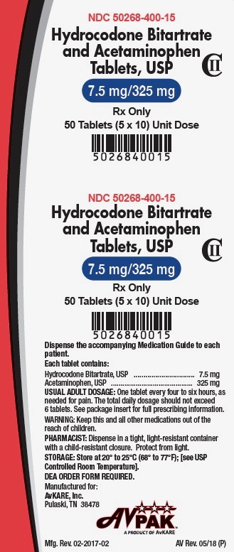 The following 3 images provide visual information about the product associated with Hydrocodone Bitartrate And Acetaminophen NDC 50268-400 by Avpak, such as packaging, labeling, and the appearance of the drug itself. This resource could be helpful for medical professionals, pharmacists, and patients seeking to verify medication information and ensure they have the correct product.