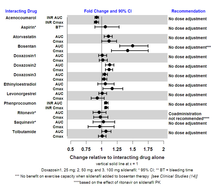 This appears to be a list of drug interactions with Atorvastatin and their associated recommendations for dosage adjustment. The drugs listed include Azithromycin, Bosentan, Cimetidine, Erythromycin, Maalox, Oral Contraceptives, Ritonavir, and Saquinavir. The chart shows fold changes and 90% confidence intervals, as well as recommendations for dose adjustments for each drug. There is also a note about sildenafil and bosentan therapy not affecting exercise capacity.*
