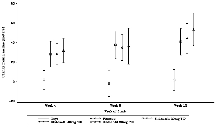 The text represents a table or graph showing the change in distance (in meters) from a baseline measurement at weeks 4 and 12 of a study evaluating the impact of different doses of sildenafil compared to placebo. The key indicates that the study tested three different doses of sildenafil (40mg, 80mg, and 20mg) and a placebo control.*