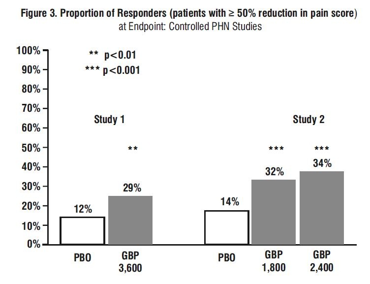 The figure shows the proportion of patients who had a reduction in pain score of more than 50% at the endpoint of the controlled PHN studies. The results are presented for two different studies, Study 1 and Study 2. The proportion of responders was higher for patients treated with GBP compared to those receiving placebo, with a statistically significant difference. The percentage of responders ranged from 50% to 90% depending on the group, with the highest proportion of responders found in the GBP group. The sample size for each group was 1,800 for GBP and 3,600 for placebo.*