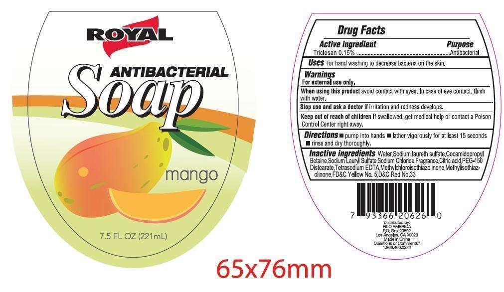 The following image provide visual information about the product associated with Royal Antibacterial (mango) NDC 50438-601 by Filo America, such as packaging, labeling, and the appearance of the drug itself. This resource could be helpful for medical professionals, pharmacists, and patients seeking to verify medication information and ensure they have the correct product.