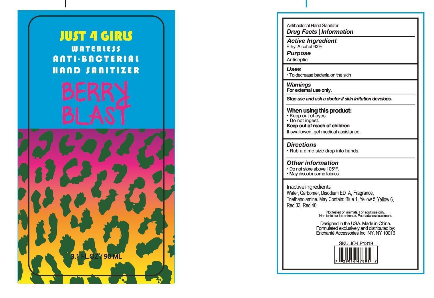 The following image provide visual information about the product associated with Just 4 Girl Waterless Anti Bacterial Hand Sanitizer Berry Blast NDC 50563-161 by Enchante Accessories Inc., such as packaging, labeling, and the appearance of the drug itself. This resource could be helpful for medical professionals, pharmacists, and patients seeking to verify medication information and ensure they have the correct product.