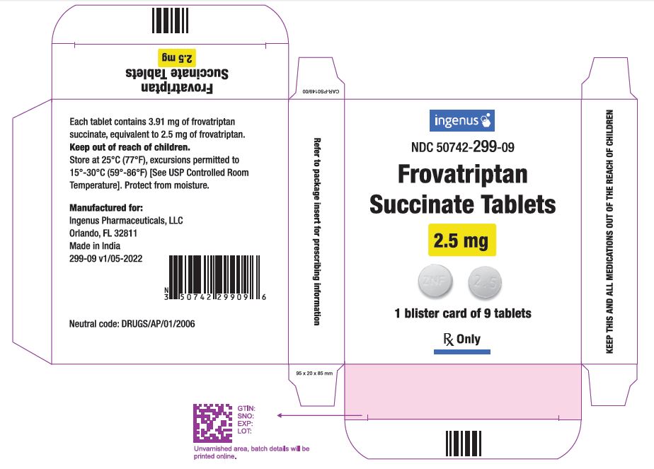 The following 7 images provide visual information about the product associated with Frovatriptan NDC 50742-299 by Ingenus Pharmaceuticals, Llc, such as packaging, labeling, and the appearance of the drug itself. This resource could be helpful for medical professionals, pharmacists, and patients seeking to verify medication information and ensure they have the correct product.