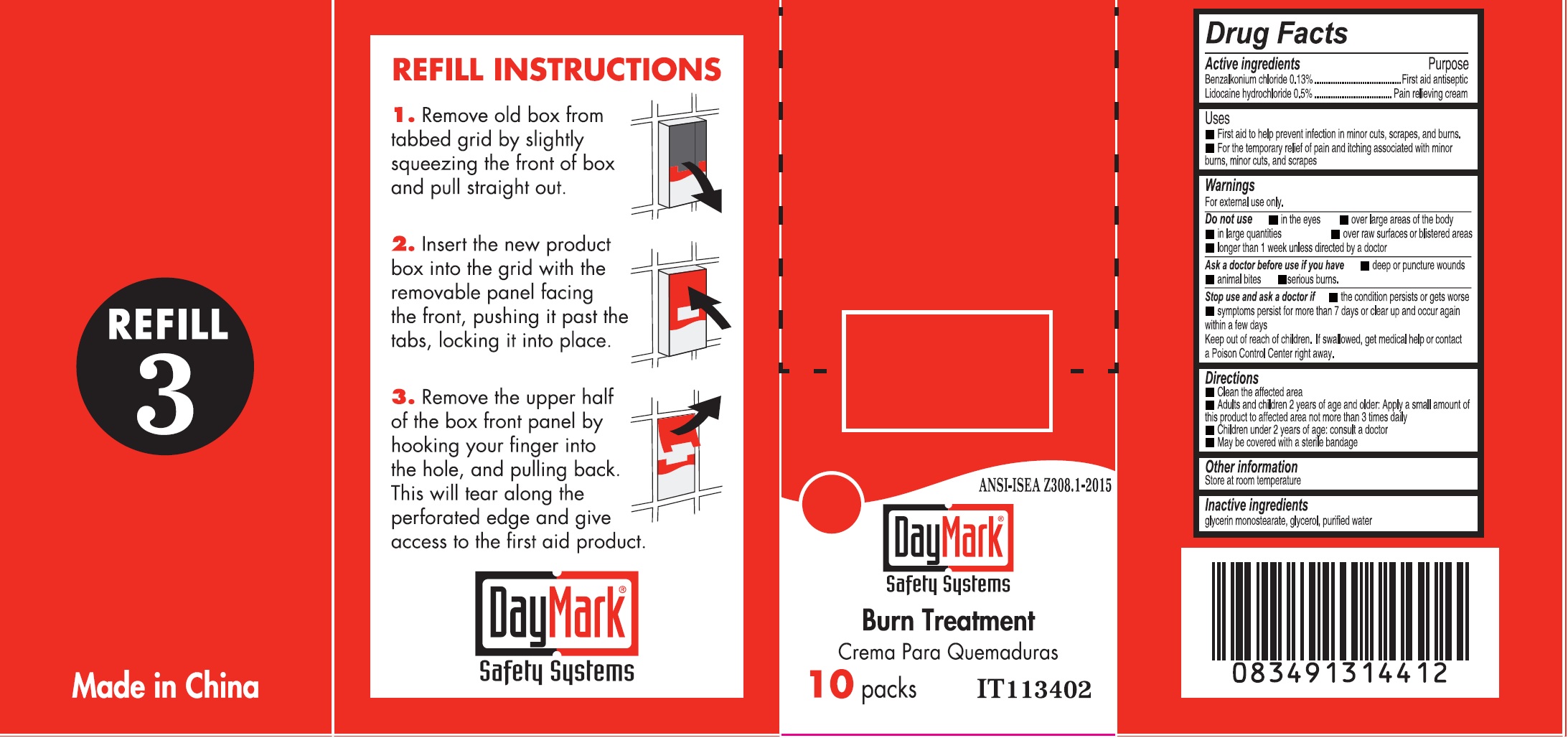 This text is a set of refill instructions for a first aid product made in China. The refill instructions provide a step-by-step guide on how to replace the product in the designated grid. It also includes information on the active ingredients, uses, warnings, and directions for using the product. The product contains benzakonium chloride and lidocaine hydrochloride for first aid antiseptic purposes and relieving cream, respectively. Additionally, it provides guidance on how to clean the affected area, age recommendations for use, and storing instructions. The product should be used externally, and if any adverse reactions occur, medical help should be sought immediately. It is essential to keep the product out of reach of children.*