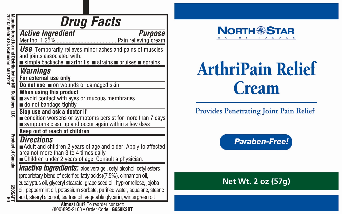 ArthriPain Relief Cream is a Menthol-based pain relieving cream that temporarily relieves minor aches and pains of muscles and joints. The cream has a proprietary blend of esterfied fatty acids and other ingredients such as aloe vera gel, eucalyptus oil, and tea tree oil. It is for external use only and must be kept away from the eyes and mucous membranes. The cream should not be used on wounds or damaged skin and should not be tightly bandaged. In addition, it comes with a warning that if symptoms worsen or persist for more than seven days or clear up and occur again within a few days, the use of the cream should be discontinued. Children under two years of age must consult a physician before use. The product is sold in the United States by North Star Nutritionals and can be reordered online or by phone.*