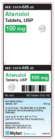 This is a prescription drug with NDC number 51079-685-20 called Atenolol available in tablet form. The tablets come in two strengths, 50mg and 100mg. The manufacturer name seems to be "Mylan" and there is some information about storage requirements. The rest of the text is not readable.*