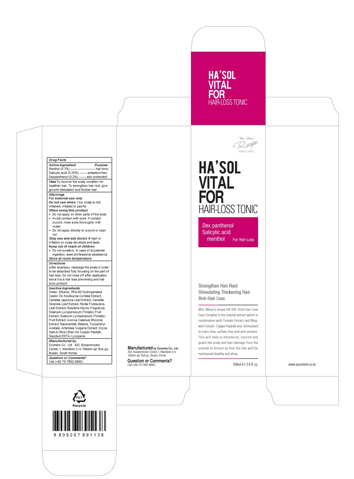 This is a drug facts label that includes information on the active ingredients and purpose of a hair loss tonic product. The tonic contains menthol, salicylic acid, and dexpanthenol, which helps strengthen hair root, stimulate growth, and thicken hair. The product should not be used on inflamed or irritated scalp, should not be applied to other body parts, should be kept away from eyes, and should not be swallowed. After shampooing, the tonic can be applied to the scalp and should not be rinsed off. The product is manufactured by Ecomine Co., Ltd. in South Korea. Contact information is provided for questions or comments. The label also includes information on the inactive ingredients and how the product works to moisturize and nourish the scalp and hair.*