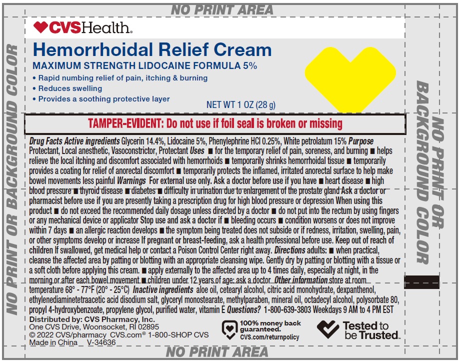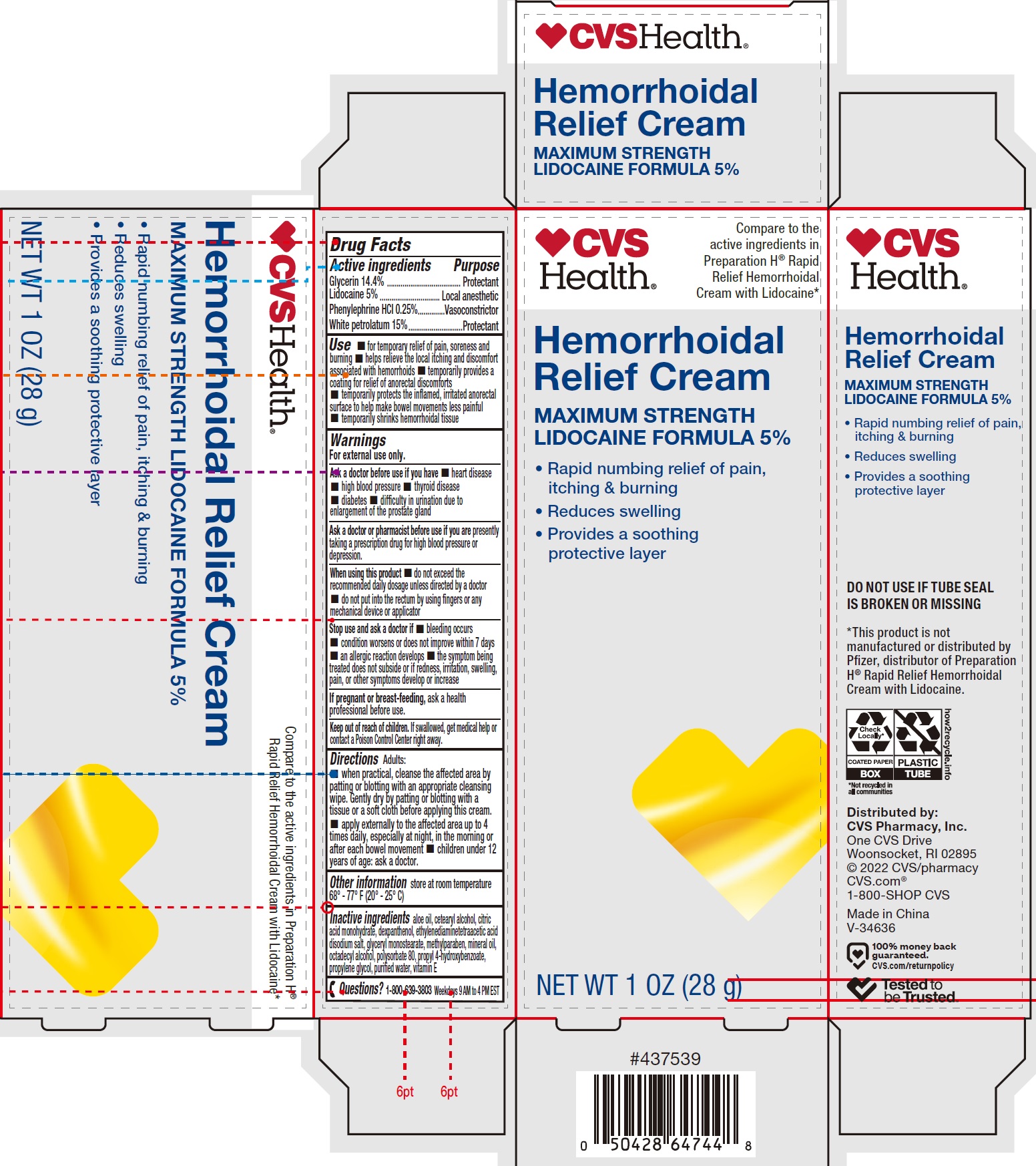 The CVS Health Hemorrhoidal Relief Cream is a maximum strength lidocaine formula that provides rapid numbing relief for pain, itching, and burning associated with hemorrhoids. It also reduces swelling and provides a soothing and protective layer. The product comes in a 1 oz (28g) tube and contains active ingredients such as Glycerin, Lidocaine, and Phenylephrine HCI. The cream also temporarily shrinks hemorrhoidal tissue and provides a coating for relief of anorectal discomfort. However, it is meant for external use only, and users must ask a doctor before use if they have heart disease, high blood pressure, thyroid disease, diabetes, or difficulty urinating due to enlargement of the prostate gland. The cream must not be used in the rectum by using fingers or any mechanical device or applicator, and users must not exceed the recommended daily dosage unless directed by a doctor. It is also advisable to stop use and ask a doctor if a bleeding condition occurs or worsens or does not improve within 7 days. The product must be kept out of reach of children, and in case of ingestion, medical help or contact with a Poison Control Center must be immediately sought. Adults are instructed to cleanse the affected area and apply the cream externally up to 4 times daily, while children under 12 years of age should ask a doctor. The product contains other inactive ingredients such as aloe oil, cetearyl alcohol, citric acid monohydrate, etc. For more information, users can contact 1-800-639-3803 on weekdays between 9 AM to 4 PM EST.*
