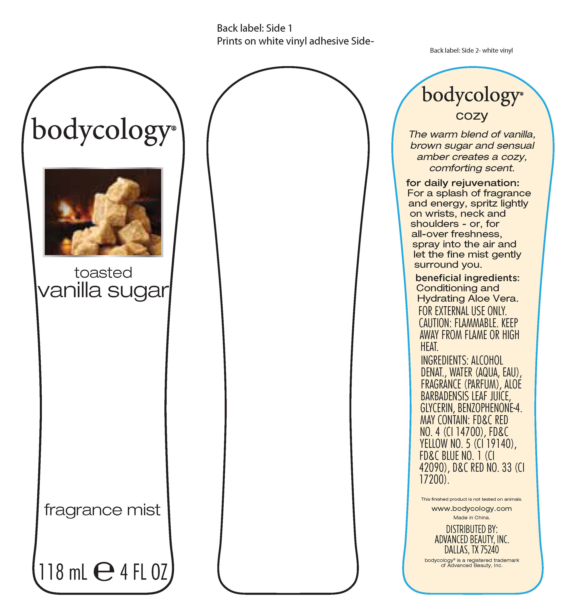 This is a back label of a Bodycology Cozy fragrance mist. The mist is made of vanilla, brown sugar, and amber that create a warm and comforting scent. The mist is for external use only and should not be exposed to high temperatures or flames. The beneficial ingredients in the mist are Aloe Vera which conditions and hydrates the skin. The mist comes in a white vinyl bottle of 118 mL or 4 FL OZ and contains FD&C Red and Yellow. It is distributed by Advanced Beauty Inc. and the product is not tested on animals.*