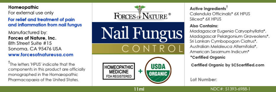The following image provide visual information about the product associated with Nail Fungus Control NDC 51393-6988 by Forces Of Nature, such as packaging, labeling, and the appearance of the drug itself. This resource could be helpful for medical professionals, pharmacists, and patients seeking to verify medication information and ensure they have the correct product.