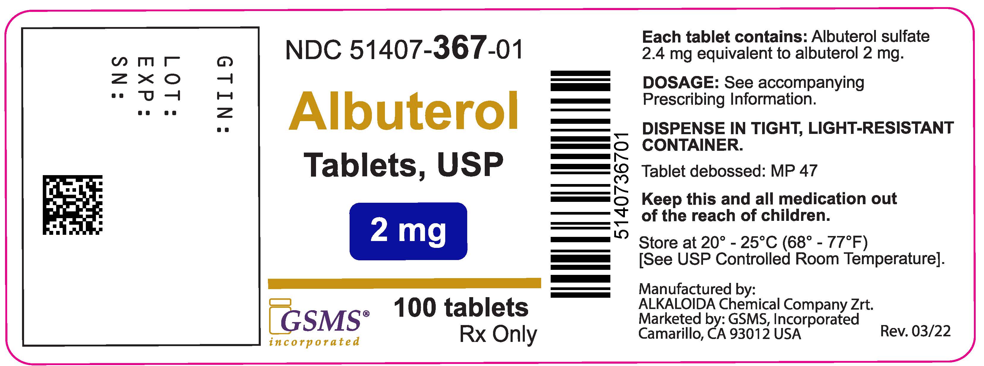 This is a description of Albuterol sulfate tablets that contain 2.4mg of Albuterol sulfate, equivalent to 2mg of Albuterol. Instructions on the recommended dosage can be found in the accompanying Prescribing Information. The tablets should be stored in a tightly sealed, light-resistant container at a temperature between 20°C - 25°C. The tablet has MP 47 printed on it. The medication should be kept out of reach of children. These tablets are marketed by GSMS Inc. for prescription use only.*