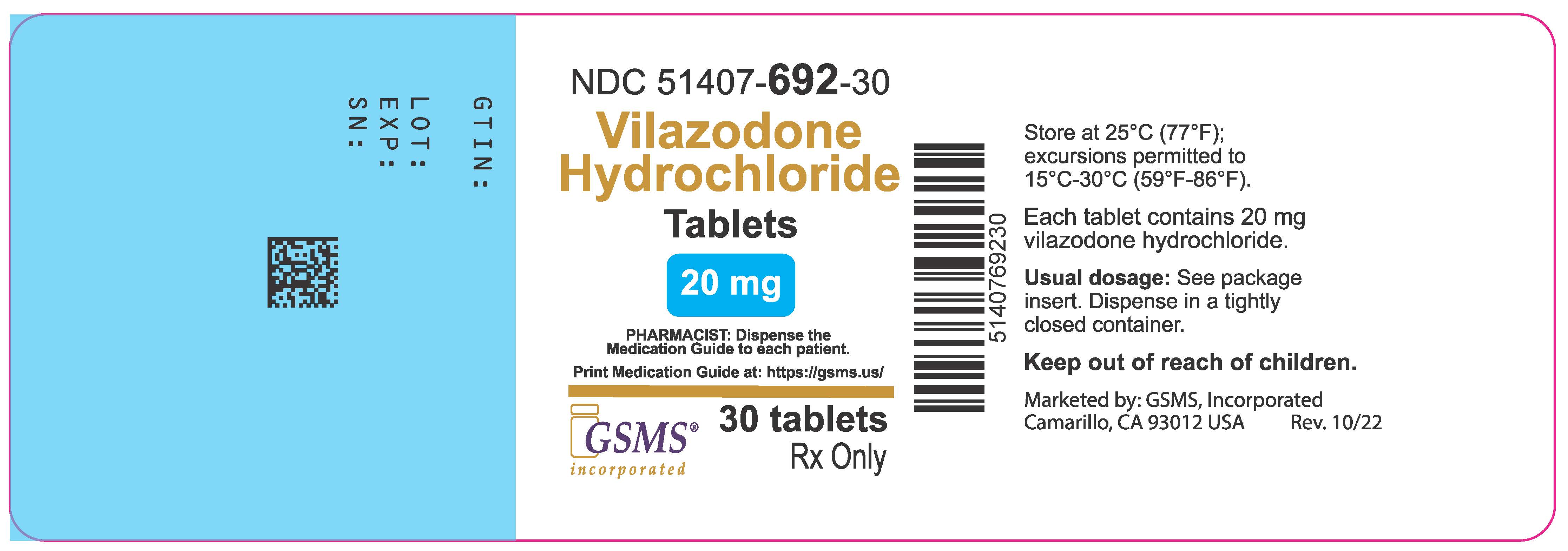 This is a medication represented by NDC code 51407-691-30 that is available in tablet form. Pharmacists are advised to dispense a medication guide to each patient and to print it from the website https://gsms.us/. The medication contains 10 mg of vilazodone hydrochloride, and the usual dosage instructions may be found in the package insert. Storage conditions for the medication require that it be kept at 25°C (77°F) with excursion permitted to 15°C-30°C (59°F-86°F). It is recommended that the medication be dispensed in a tightly closed container and kept out of reach of children. The medication is marketed by GSMS, Incorporated, and is available by prescription only.*