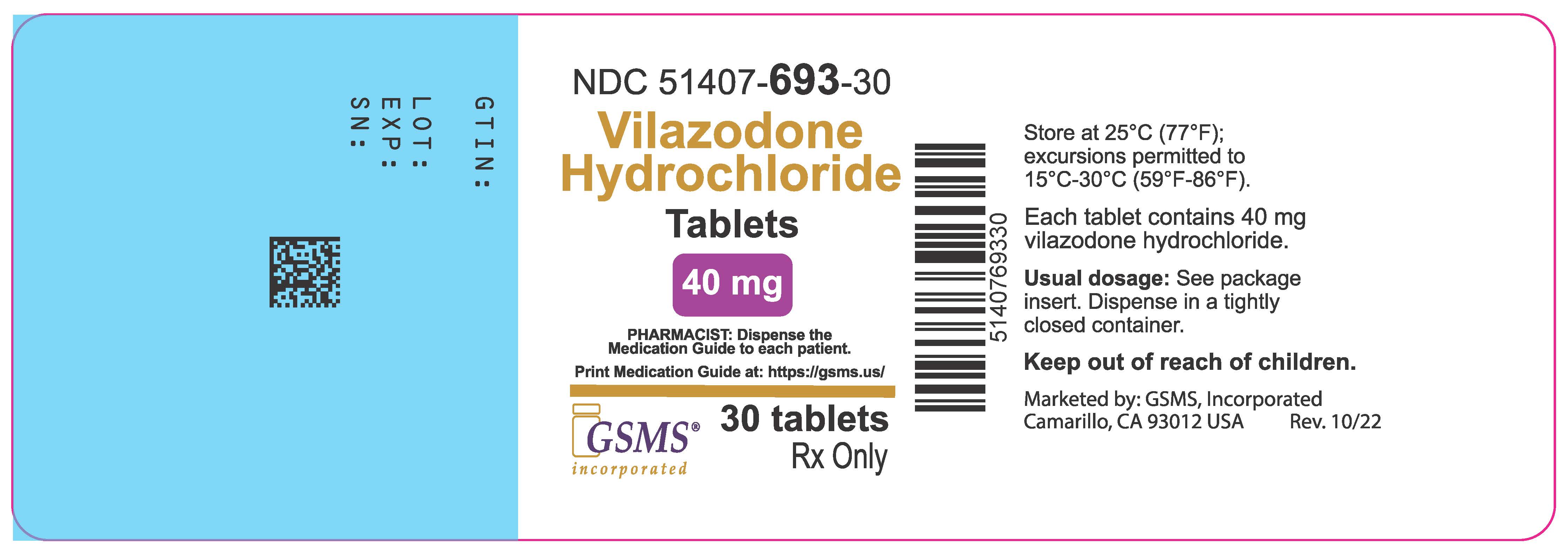 Vilazodone hydrochloride tablets are a medication that contains 40 mg of the active ingredient. It is recommended to dispense the Medication Guide to each patient and follow the instructions provided in the package insert. Remember to keep the medication in a tightly closed container, away from children, at a temperature between 16°C-30°C (59°F-86°F). This medication is marketed by GSMS, Incorporated and is available by prescription only.*