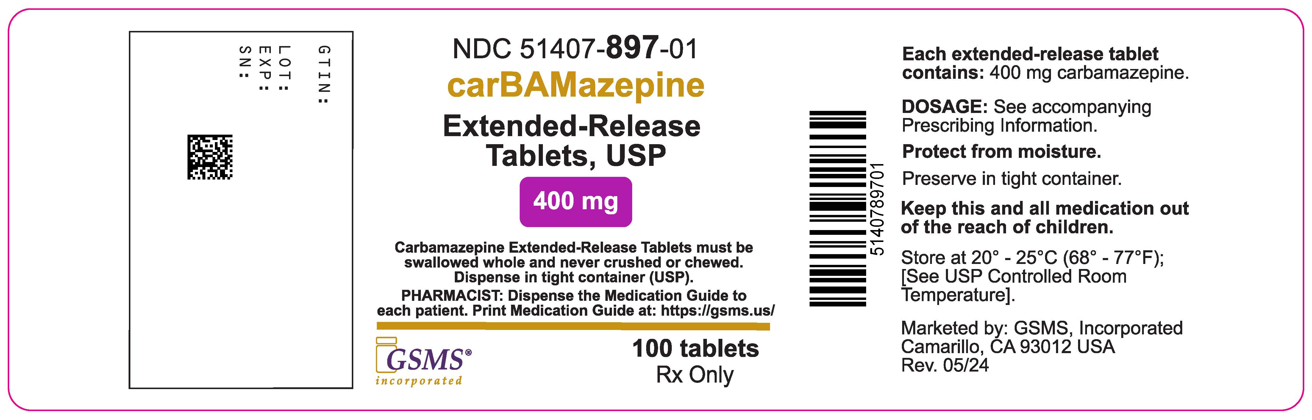 This is a description of Carbamazepine Extended-Release Tablets, USP 400 mg. The tablets should be swallowed whole and not crushed or chewed. The prescription should be dispensed in a tight container. The pharmacist should provide a Medication Guide to each patient. Each tablet contains 400 mg of carbamazepine. The recommended dosage and prescribing information should be followed, and the tablets should be protected from moisture and stored at 20° - 25°C (68° - 77°F). The medication should be kept out of reach of children. The product is marketed by GSMS, Incorporated in Camarillo, CA, USA.*