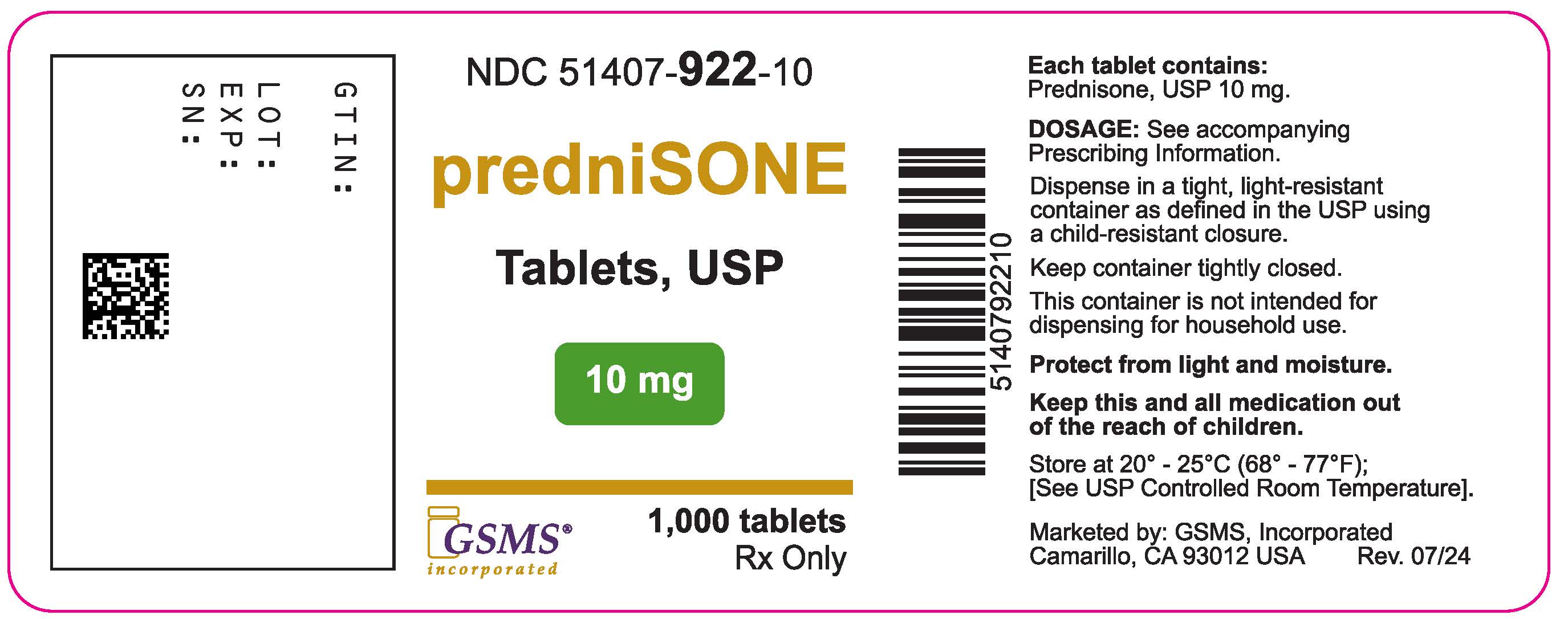 The following 4 images provide visual information about the product associated with Prednisone NDC 51407-922 by Golden State Medical Supply, Inc., such as packaging, labeling, and the appearance of the drug itself. This resource could be helpful for medical professionals, pharmacists, and patients seeking to verify medication information and ensure they have the correct product.
